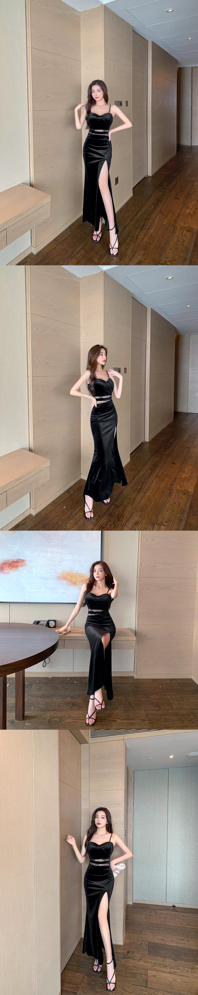 イブニングドレスロングスカート女性の夜の宴会気質セクシーなVネックレースステッチベルベットハイスリットサスペンダードレス micat3834769487