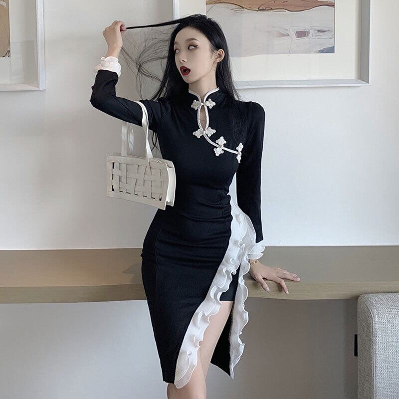 フランスのイブニングドレス女性の秋のハイエンドハイエンドの若いセクシーなミドル丈の改良されたチャイナドレス micat88663539457