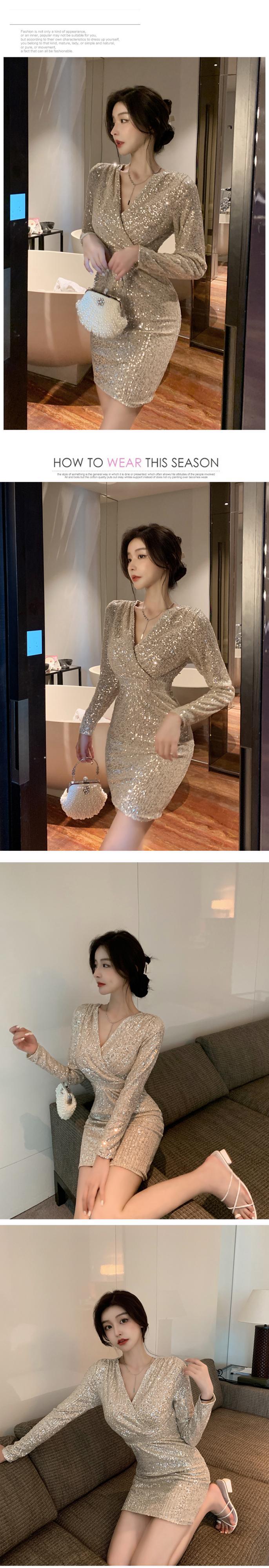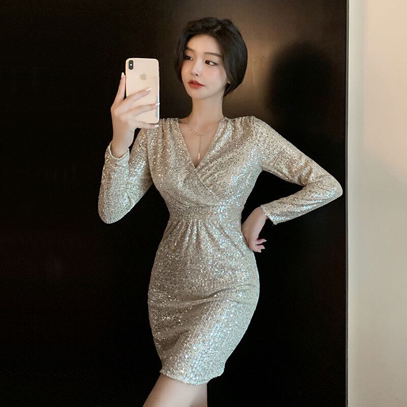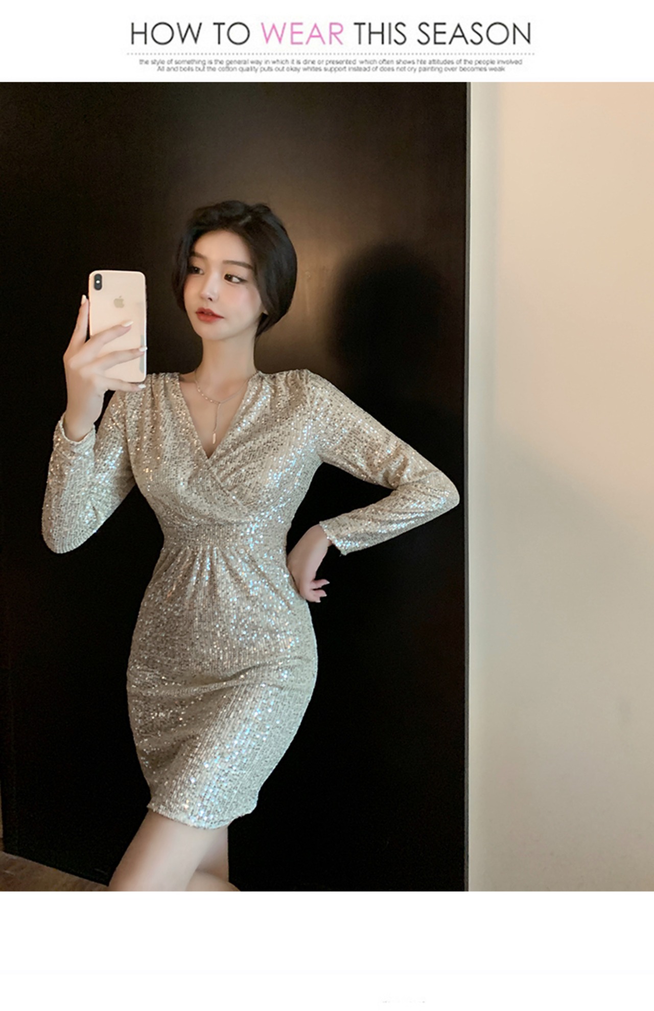 ナイトクラブの女性の夜のシーン光沢のある小さなドレスショートセクシーなVネックウエストスリム長袖ヒップドレス micat11218663140