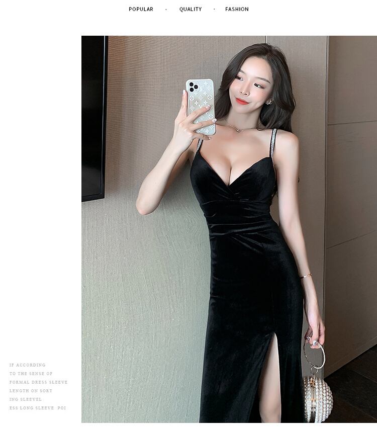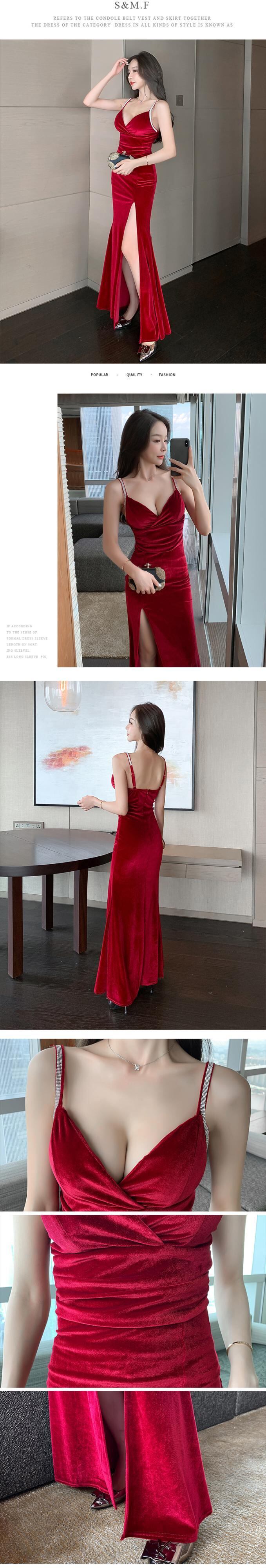 イブニングドレスロングドレスナイトクラブレディースナイトバンケット気質セクシーなローカットVネックゴールドベルベットサスペンダードレス micat20886938016