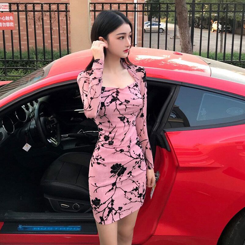 2021年初秋新しい女性のフレンチレトロプリントセクシーなスクエアカラースリムバッグヒップボトミングドレス micat7389240802