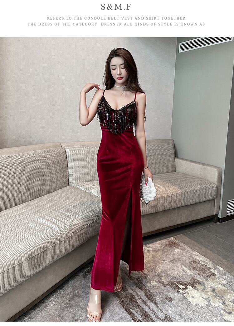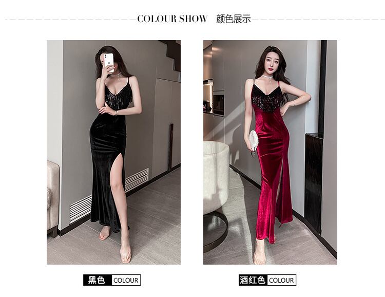イブニングドレスロングドレスナイトクラブ女性の高級宴会eign気質セクシーなVネックスパンコールゴールドベルベットサスペンダードレス micat1487135759