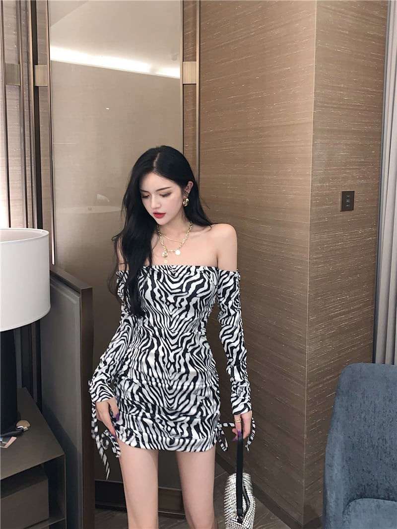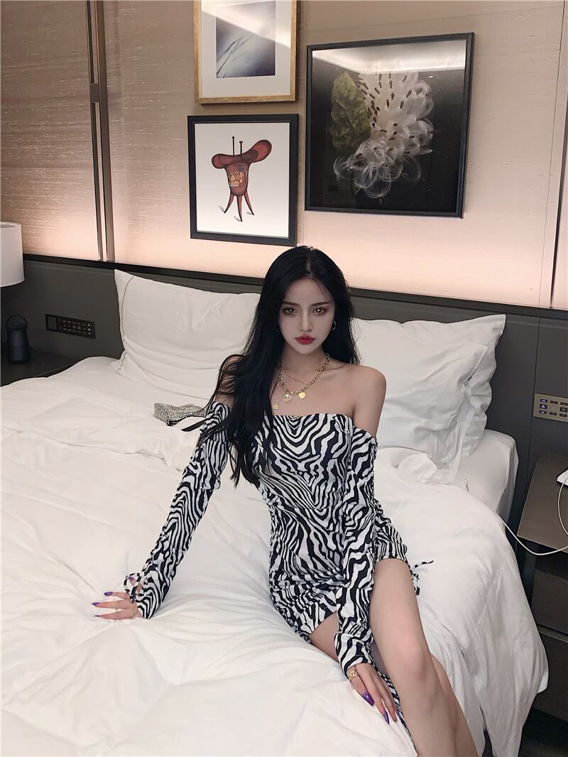 ネットレッドライブ放送服女性アンカー服秋セクシーワンショルダーゼブラ柄長袖スリムバッグヒップドレス micat40382484321