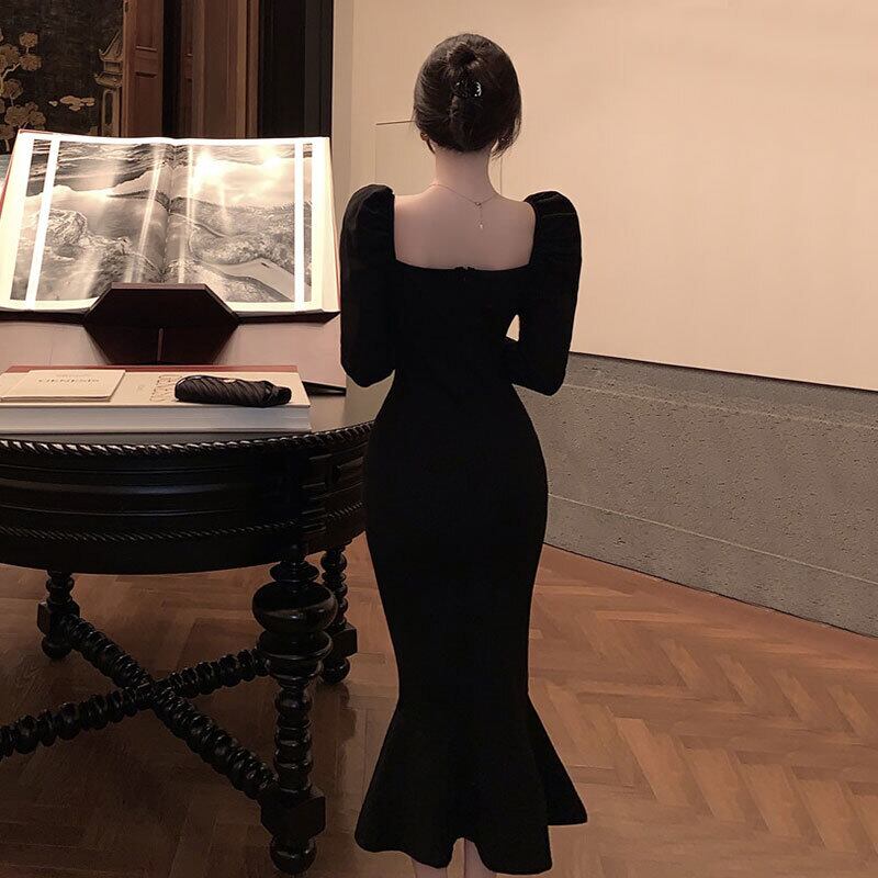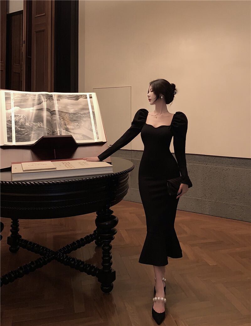 フレンチレトロヘップバーンスタイルリトルブラックドレスロングスカートレディース秋冬ハイエンドスクエアネックパフスリーブスリムスリムドレス micat16194963075