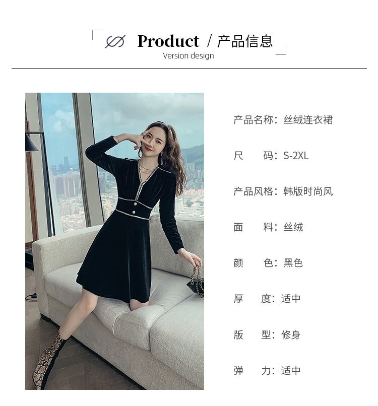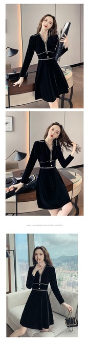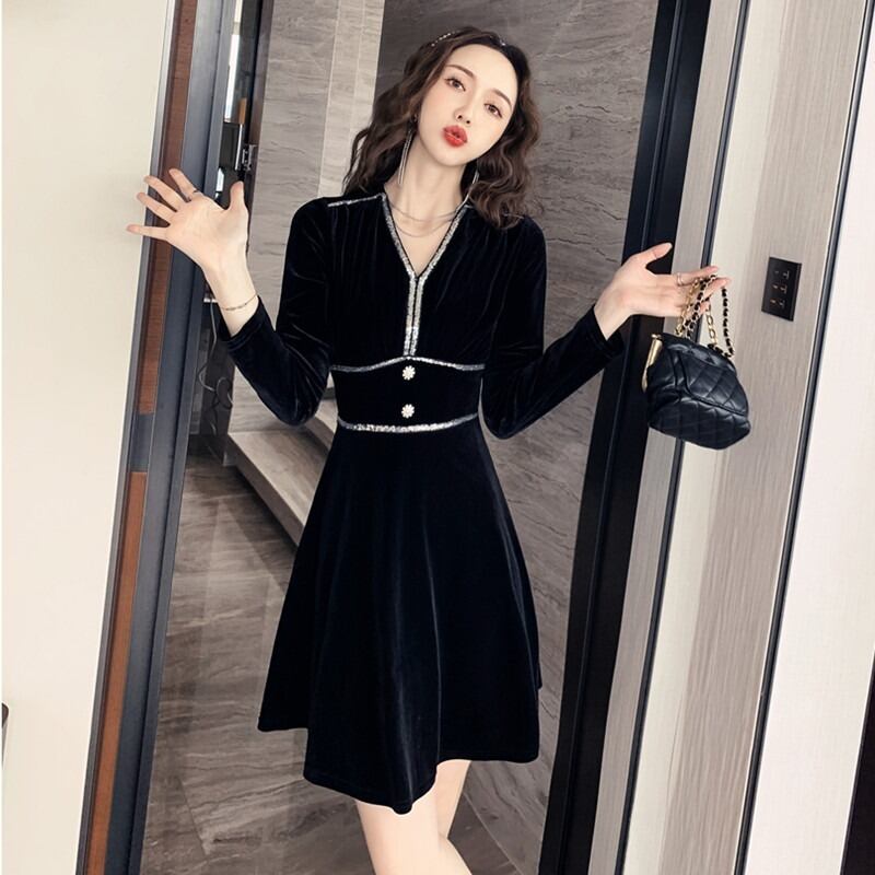-冷たい成熟したロイヤルシスタースタイルの女性の秋と冬の気質Vネックウエストスリムブラックゴールドベルベットドレス micat86321951315