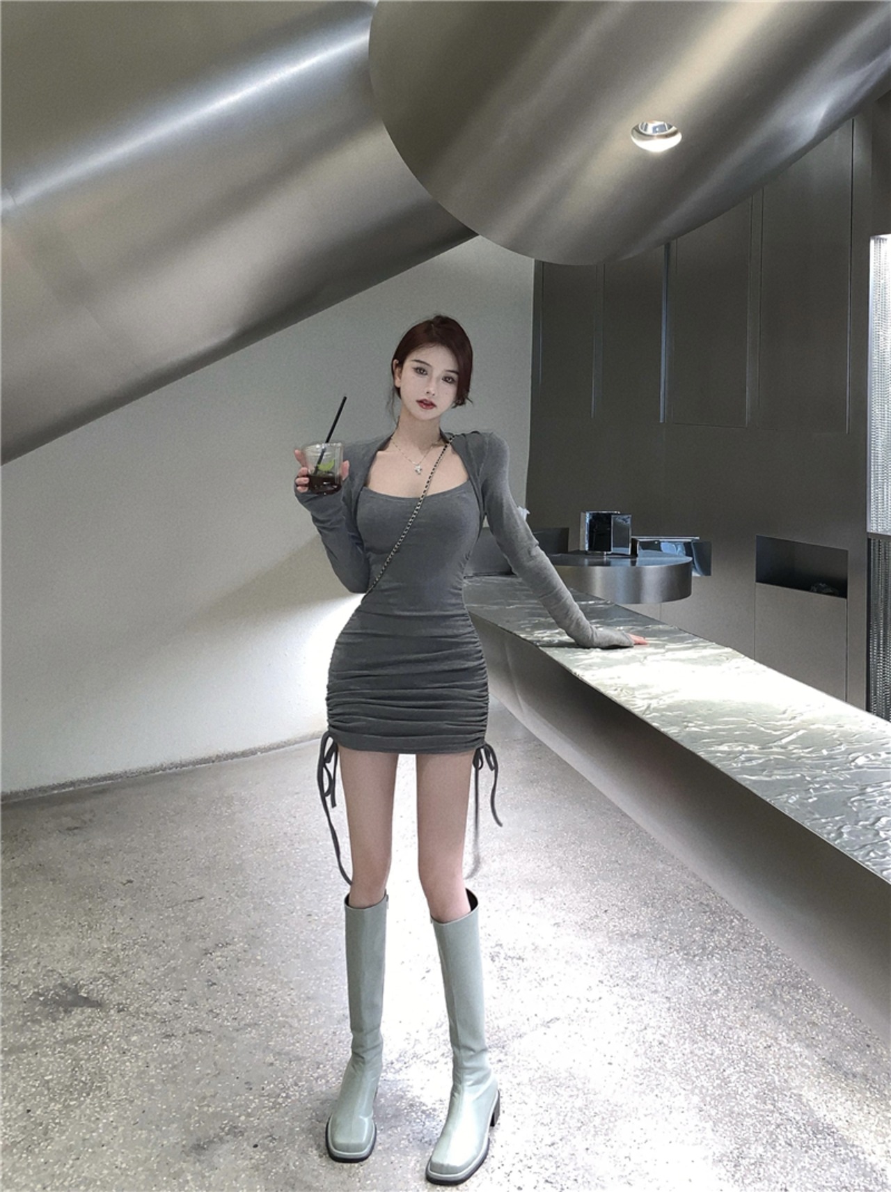 初秋のフェイクツーピースドレス女性ピュアラストセクシースクエアネック巾着無地ボトミングタイトバッグヒップスカート micat87608633371