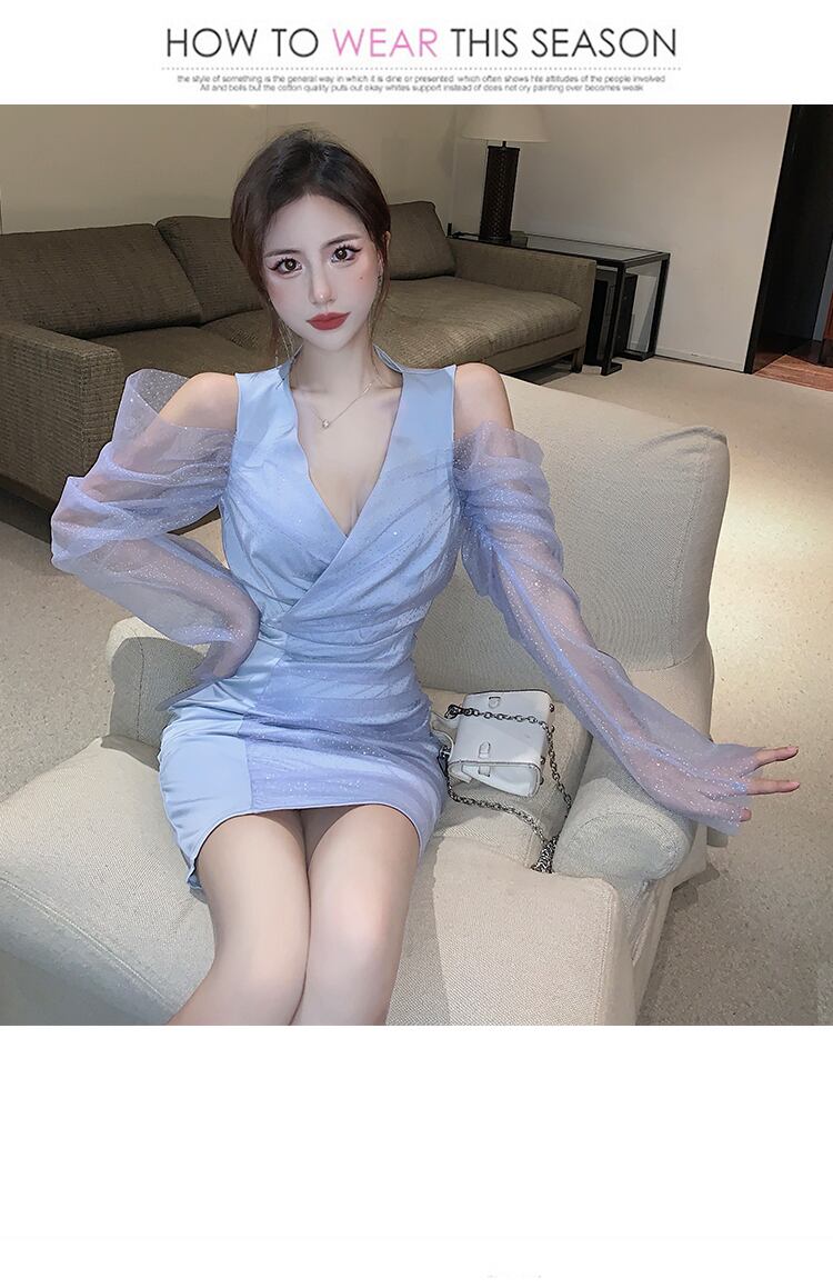 ナイトクラブレディースナイトクラブナイトシーンスパークリングフレンチドレスセクシーなローカットディープVネック長袖オフショルダードレス micat38298515760