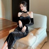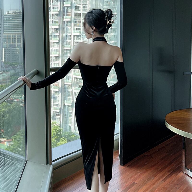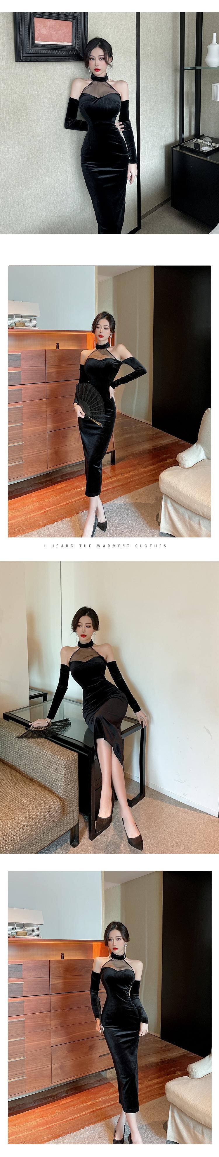 イブニングドレスレディース秋冬ナイトマーケットストアセクシーメッシュステッチストラップレスゴールドベルベット長袖ミドル丈ホルタードレス micat7798097128