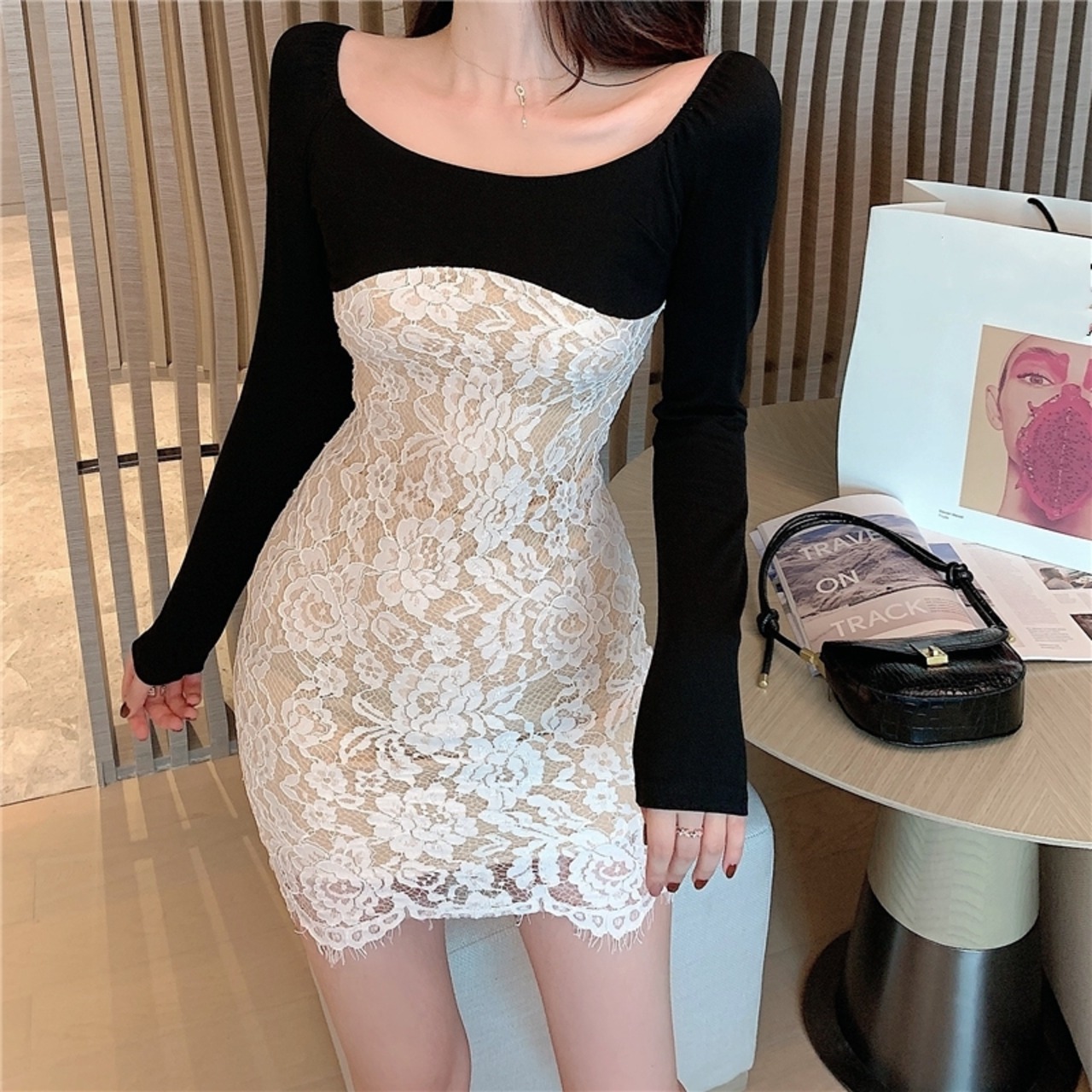 生放送服女性アンカー服ポジェニックハイエンドセクシーオフショルダーレースステッチ長袖バッグヒップボトミングドレス micat28522902097
