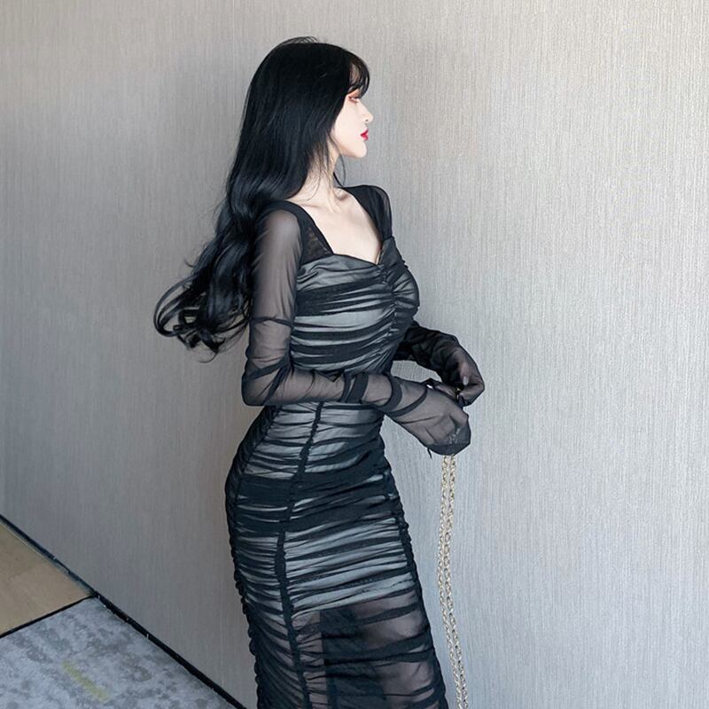 イブニングドレスレディースバンケット気質オーラセクシーメッシュステッチプリーツクイーンスリムスリムミドル丈ワンピース micat21648878698