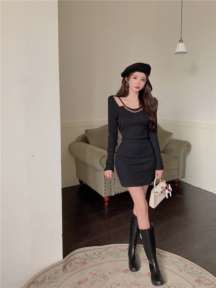 2021年秋新しい女性のセクシーなくり抜かれた肩スリムバッグヒップニット長袖サスペンダードレス micat33328129826
