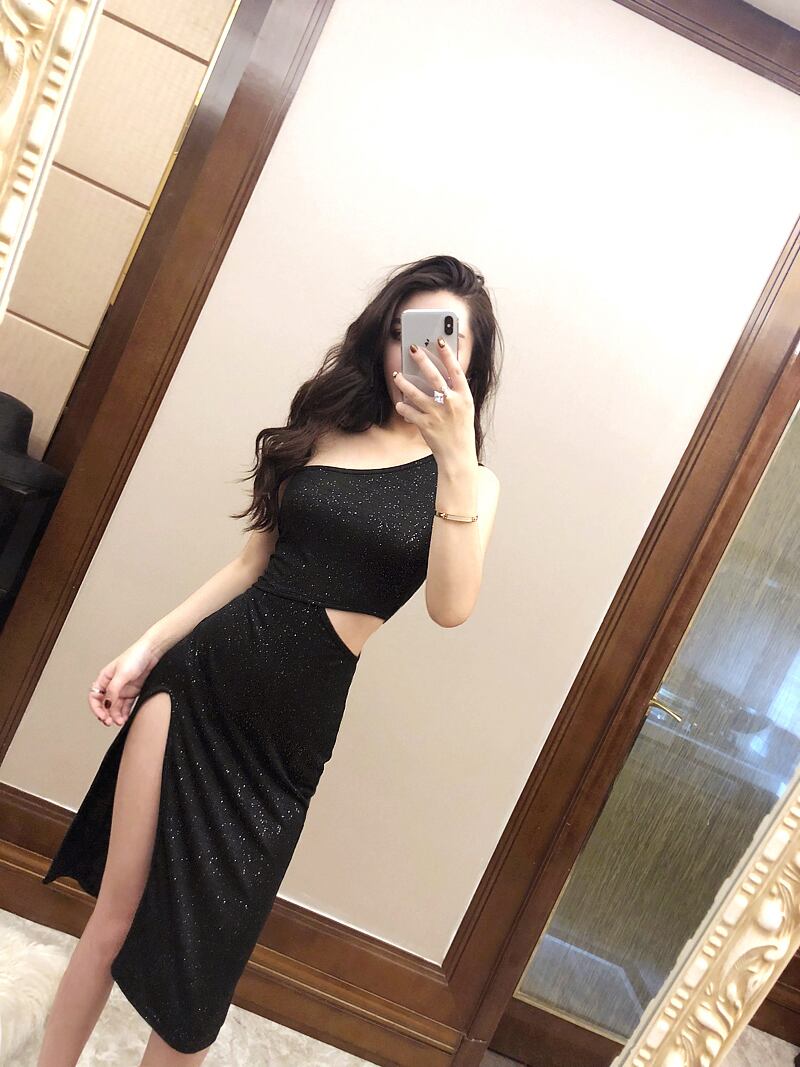 ドレス、小さなドレス、宴会の気質、光沢のある明るいシルク、セクシーな傾斜した首、漏れやすい肩、くり抜かれた、ウエストレス、ノースリーブ、サイドオープニングドレス micat69983306471