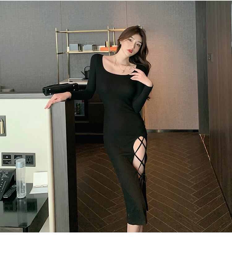 秋の婦人服2021年新気質女神ファンセクシークロスストラップスリット長袖ミドル丈ワンピース micat88338853764
