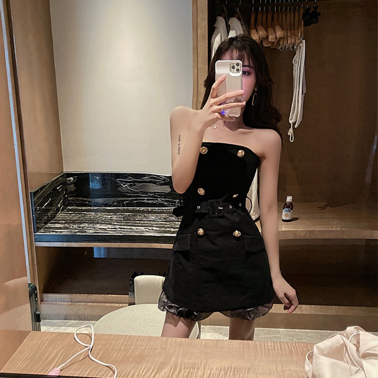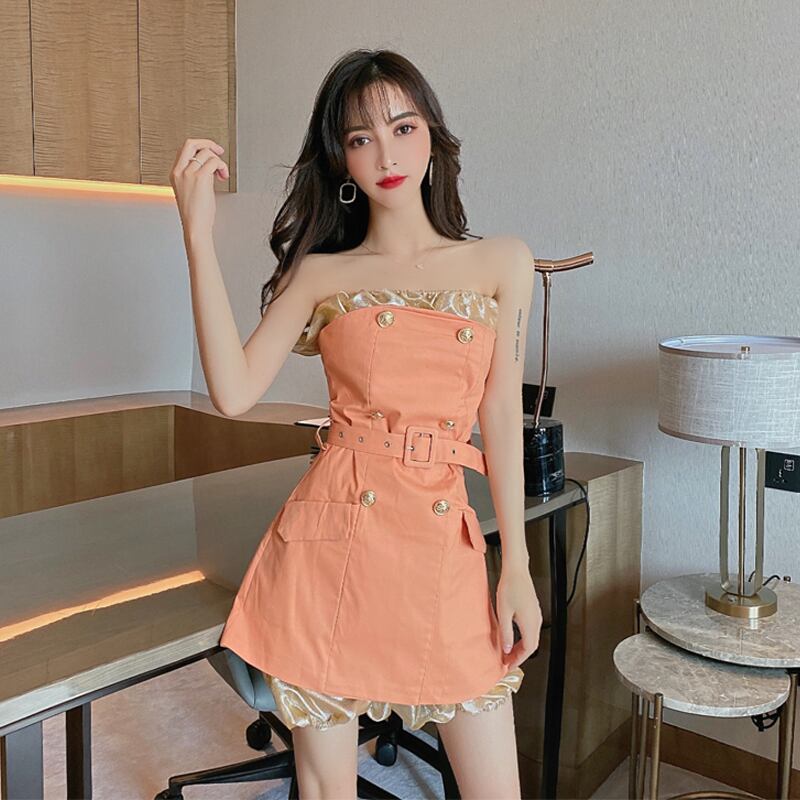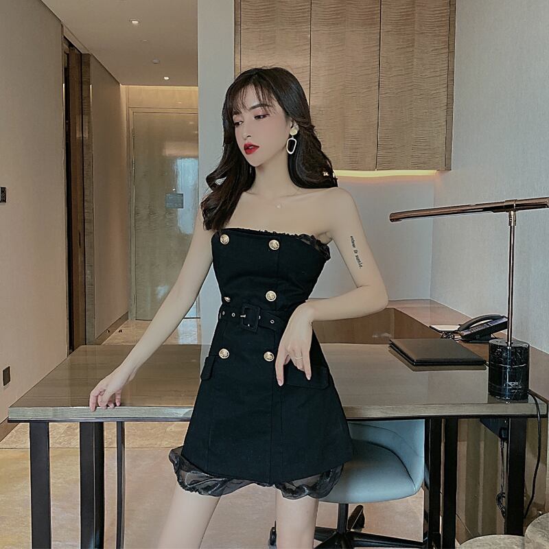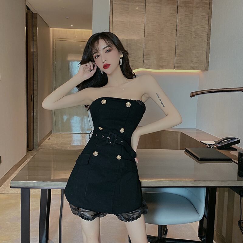 ナイトクラブバーレディース気質セクシーワンショルダーダブルブレストレースアップウエストスリムデニムチューブトップドレス micat91493909744