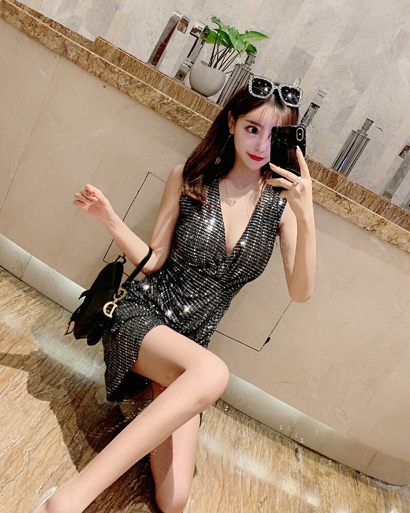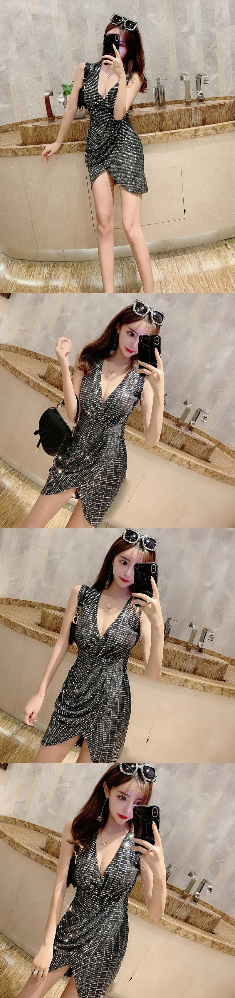 ナイトクラブバーレディーススパークリングスパンコールワンピースセクシーローカットディープVネックウエストスリミングノースリーブワンピース micat90776874059
