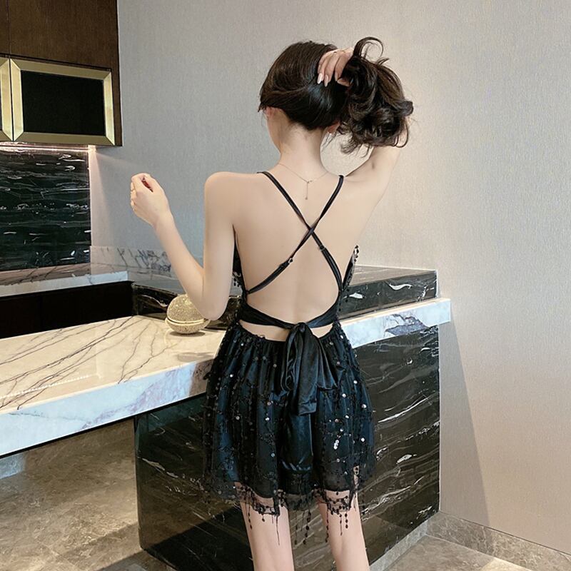 ショートドレスナイトタイムレディースドレススモールドレススパンコールテルローカットディープVネックオープンチェストビッグリーキーバックドレス micat28291514165