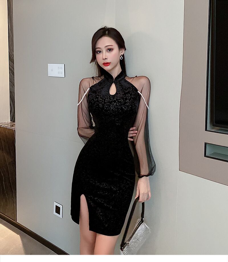 改良されたチャイナドレス2021新しい秋の女性の気質エレガントでセクシーなメッシュステッチゴールドベルベットドレス micat5322337305