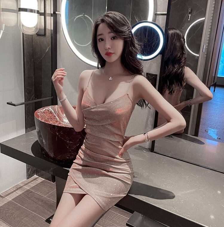 宴会気質光沢のあるシルクの小さなドレスショートナイトショーセクシーなローカットVネックサスペンダースカートナイトクラブドレス micat68457643210