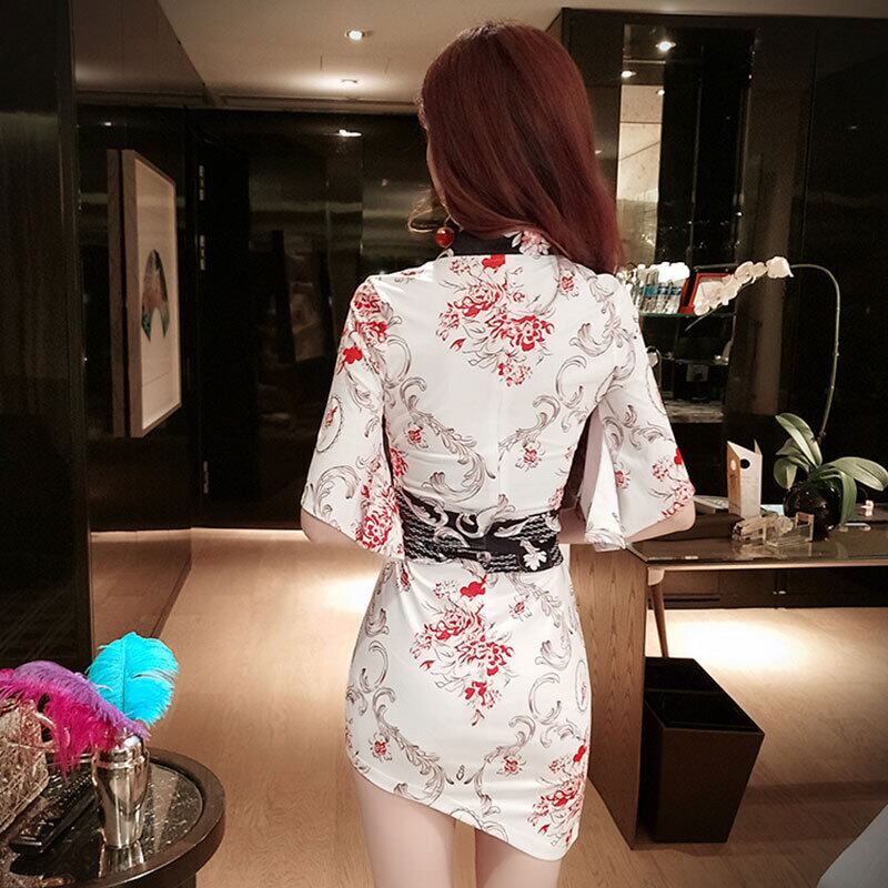 夜の女性のレトロなプリントセクシーなVネックローカットヒップベルスリーブ技術者フットバスワーク着物ドレス micat107158589