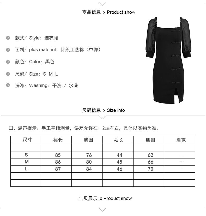 フランスのニッチはチャイナドレスの夏の気質を改善しましたセクシーなスクエアネックパフスリーブブラックスリムバッグヒップスリットドレス micat83605430415