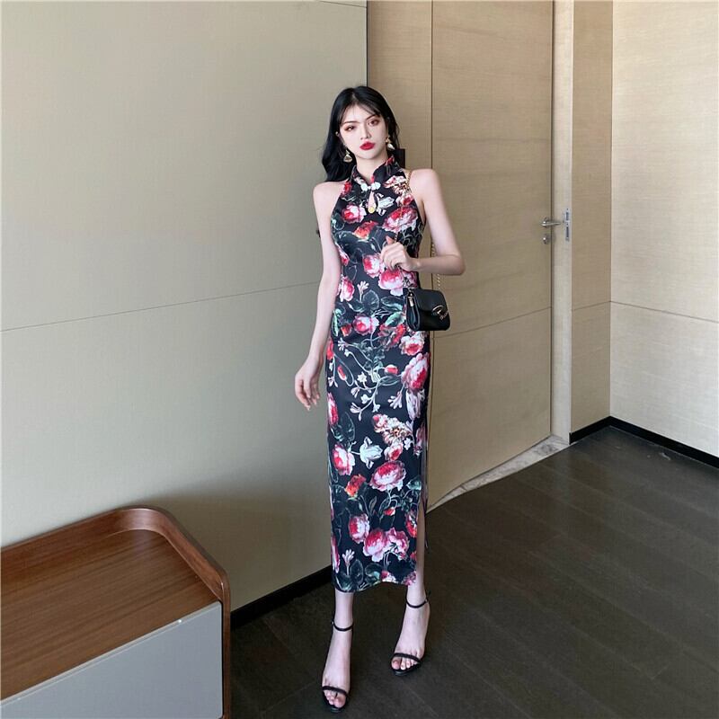 チャイナドレスの改良版女性の若いレトロなプリントノースリーブのセクシーなミドルドレス micat19511067765
