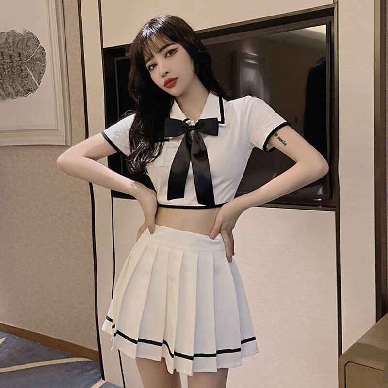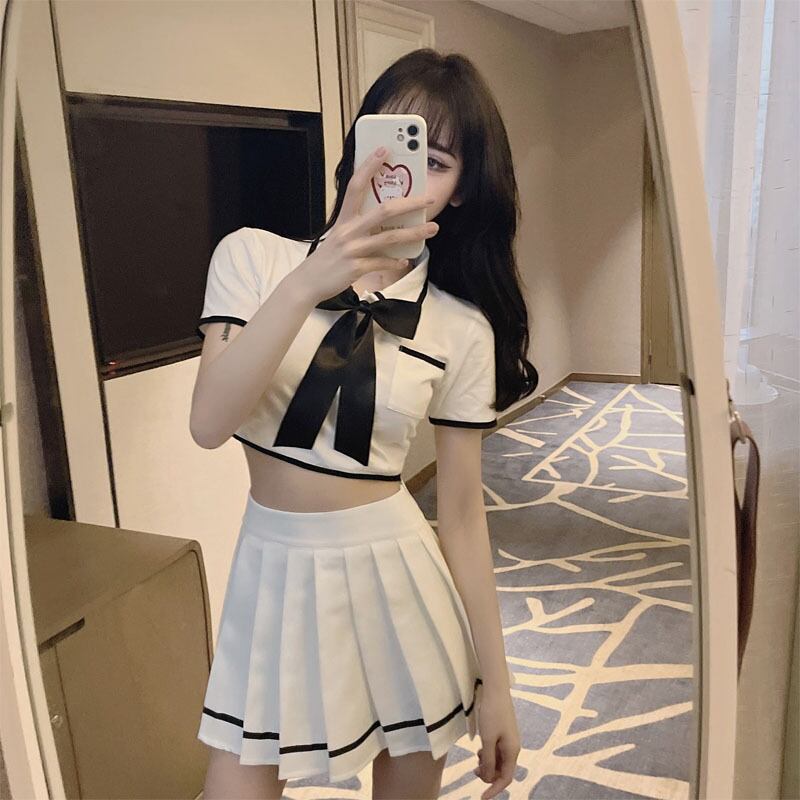 jkユニムスーツ女子大生スタイル蝶ネクタイ半袖トップス+ハイウエストプリーツショートスカートツーピースセット micat66680290511