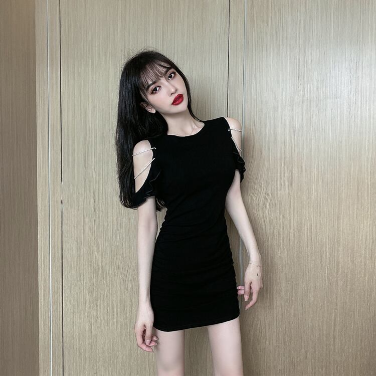セクシーなオフショルダードレス2021年夏の新しい女性の光沢のあるチェーン半袖黒タイトフィットヒップスカート micat76365512816