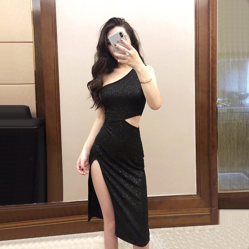 黒のイブニングドレスナイトクラブの女性の輝く気質セクシーなスラントネックワンショルダーオフショルダーノースリーブミドルドレス micat40052933263
