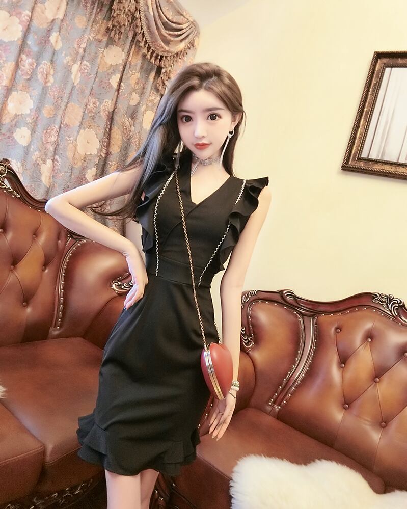 セレブ気質ドレス女神ファン2021夏セクシーVネックウエストスリムフリルフィッシュテールバッグスカート micat13855552018