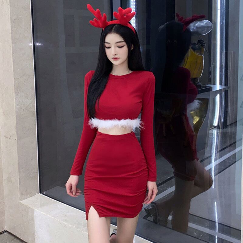 クリスマステーマの服スーツ女性の赤と白の毛深いセクシーなショートへそトップ+ショートスカートツーピースセット micat35335947372