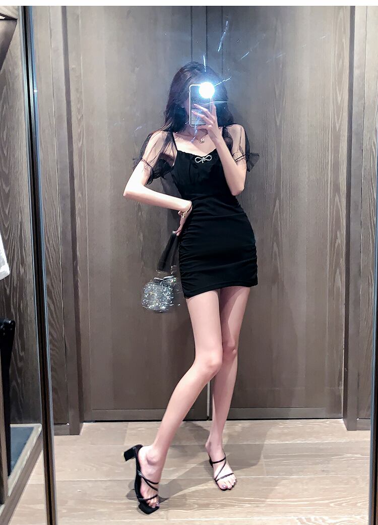 フレンチリトルブラックドレスヘップバーンショートライトドレス気質セクシーメッシュステッチパフスリーブヒップドレス micat5135613093