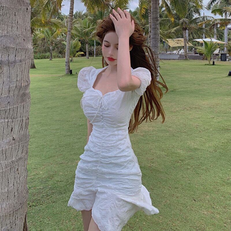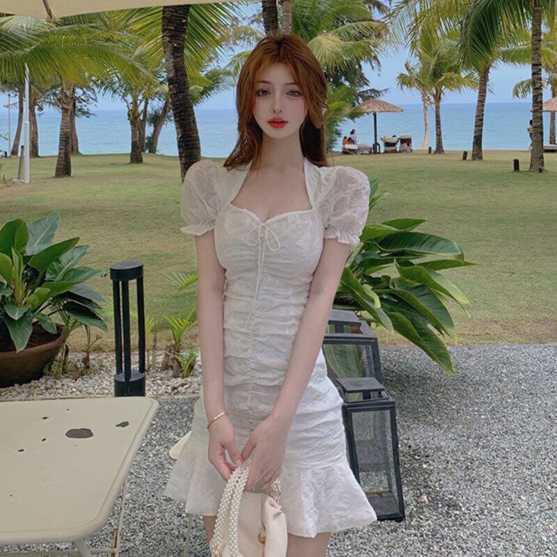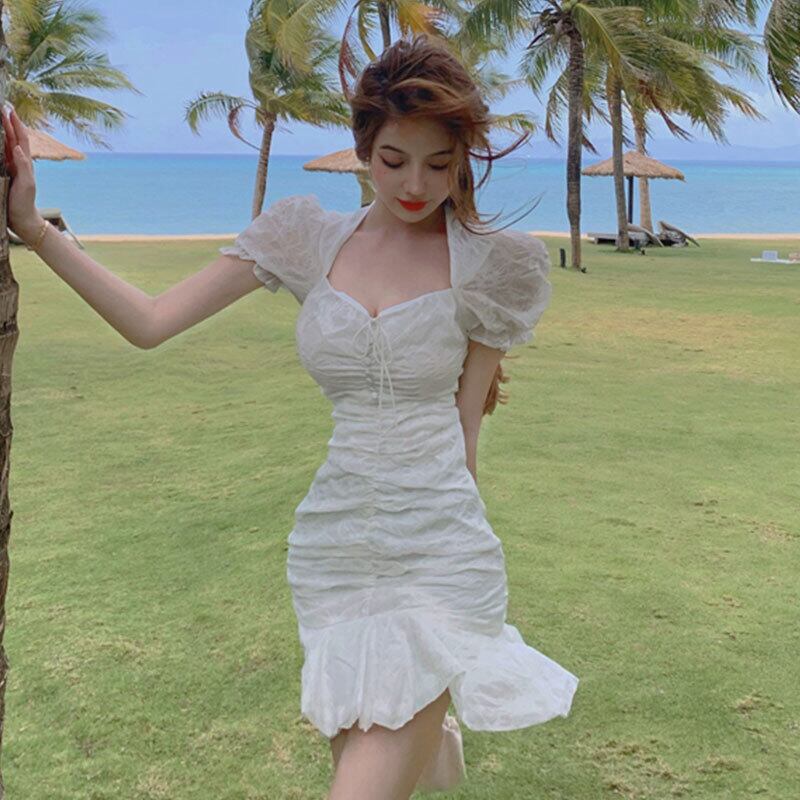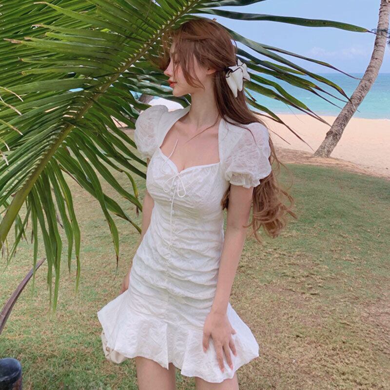 フランス初恋スウィートドレス夏森スーパーフェアリーパフスリーブバッグヒップショートフィッシュテールスモールホワイトドレス micat72069818660