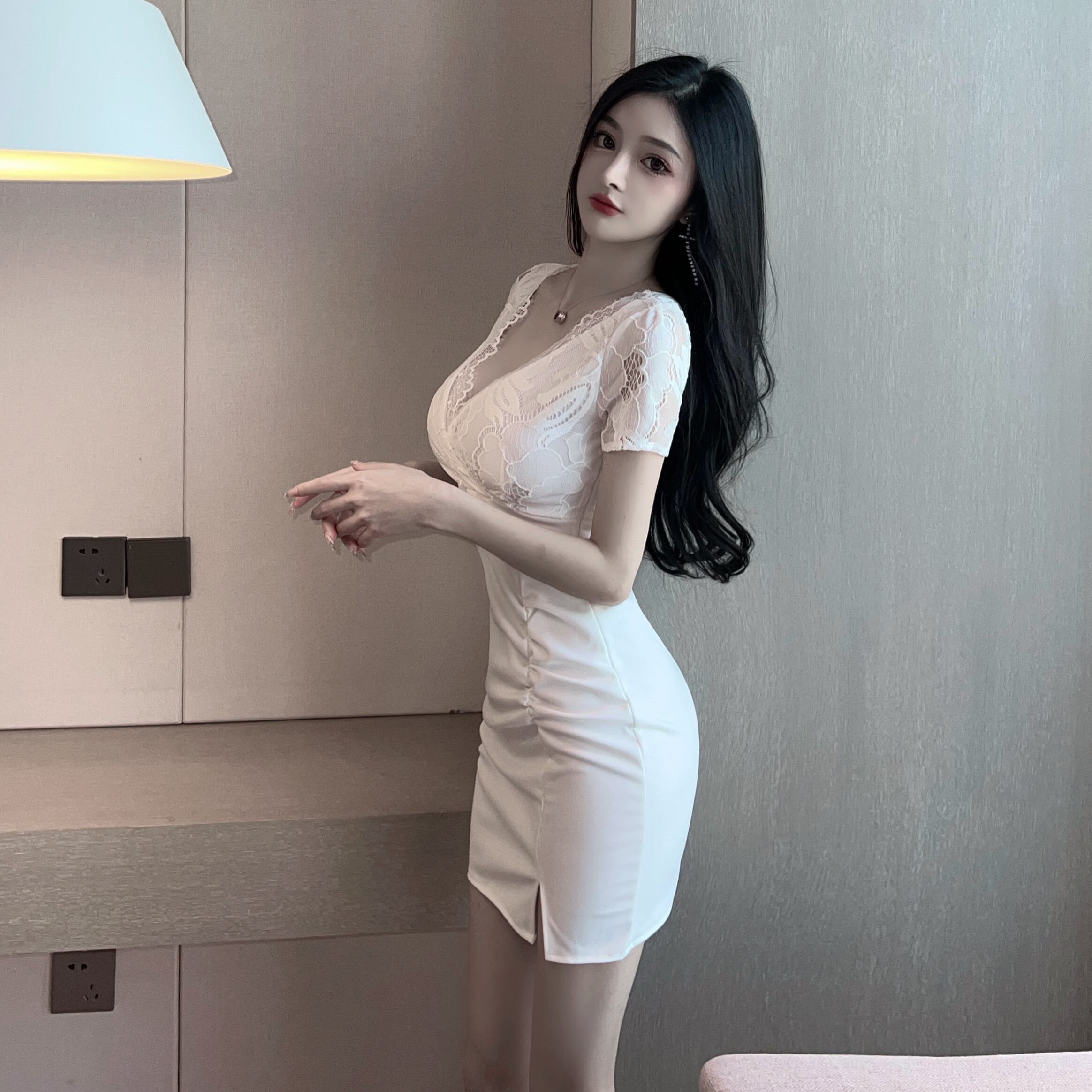ナイトクラブレディースナイトクラブ気質セクシーオーバーオールローカットディープVネックレースステッチパッケージヒップドレス micat56275495711