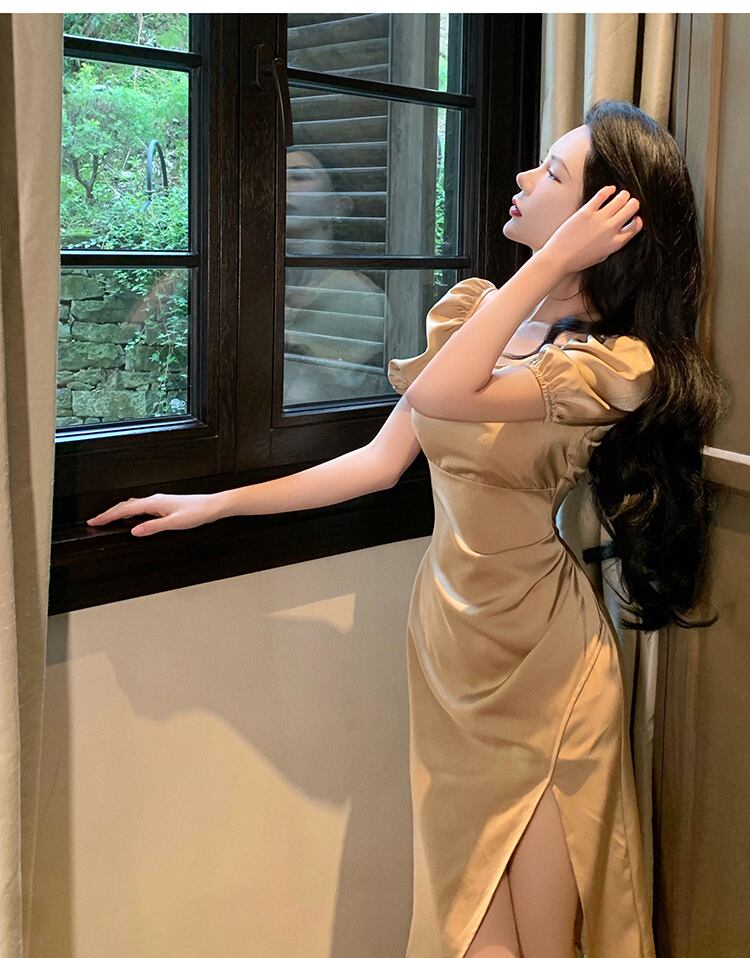 フランスのニッチな膝上ロングスカートハイエンドパフスリーブスカートハイエンド気質は薄くてハイスリットのセクシーなドレス micat59666790162