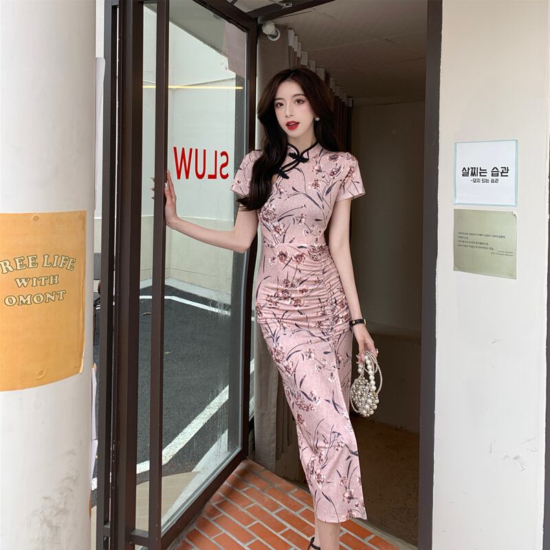チャイナドレス若いハイエンド気質レトロフローラルセクシースリムフィットスリムスリット半袖ミドル丈ドレス micat40853645212