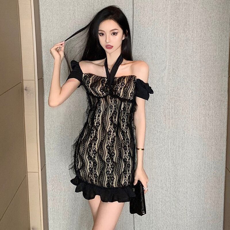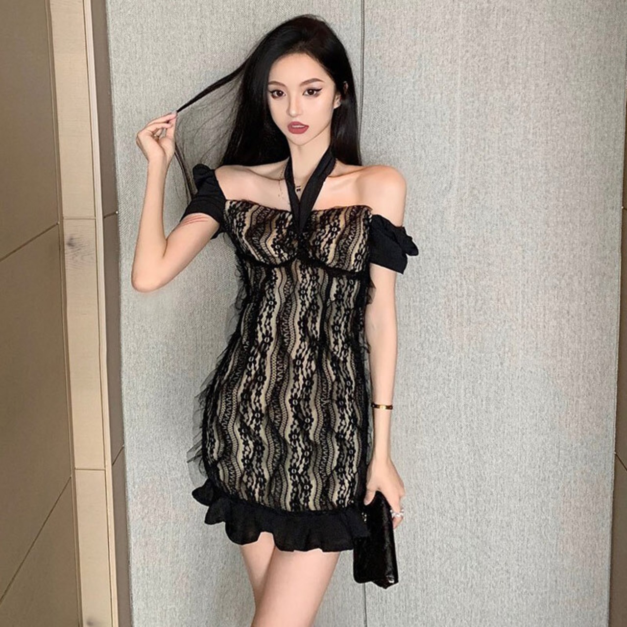 ライトラグジュアリースモールドレスショートハイエンド気質フレンチパフスリーブセクシーレースフィッシュテールオフショルダーホルタードレス micat42939513045