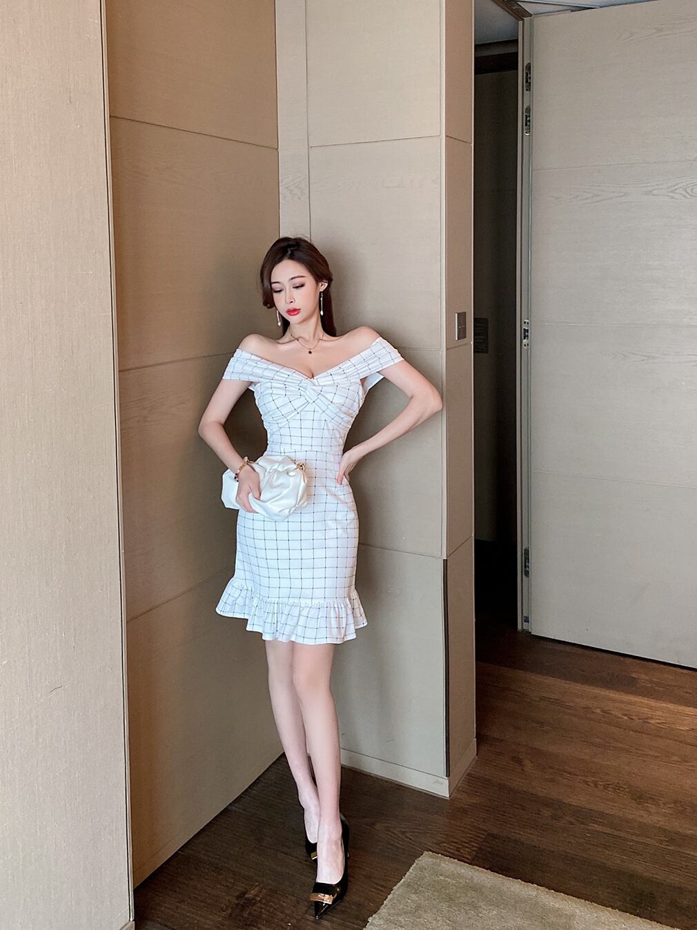 ライトラグジュアリースモールドレスナイトショップレディースフレンチショートドレス気質セクシーワンショルダーチェック柄フィッシュテールドレス micat69685685294
