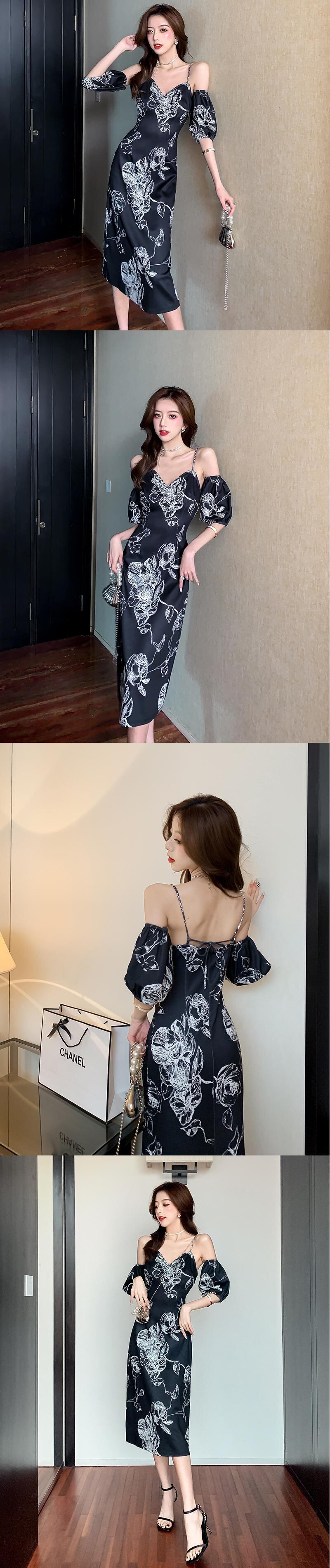 イブニングドレス女性のハイエンド気質フレンチパフスリーブレトロ旅行休暇セクシーなミドル丈サスペンダードレス micat15638774376