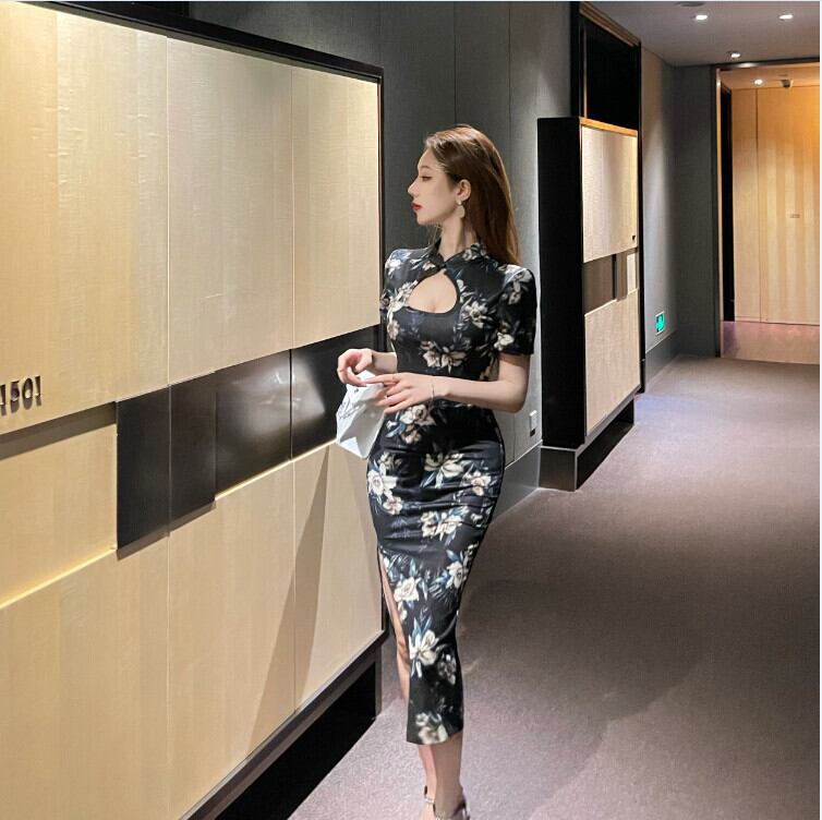 チャイナドレス2022新しい若いスタイル中華民国スタイルのレトロな印刷セクシーな改良版半袖ミッドレングスドレス micat49108453699
