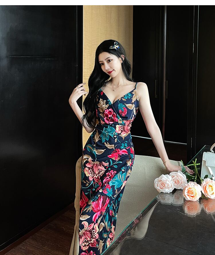 イブニングドレスレディースハイエンド気質海辺バケーションレトロプリントセクシーローカットVネックミドル丈サスペンダードレス micat89581521127