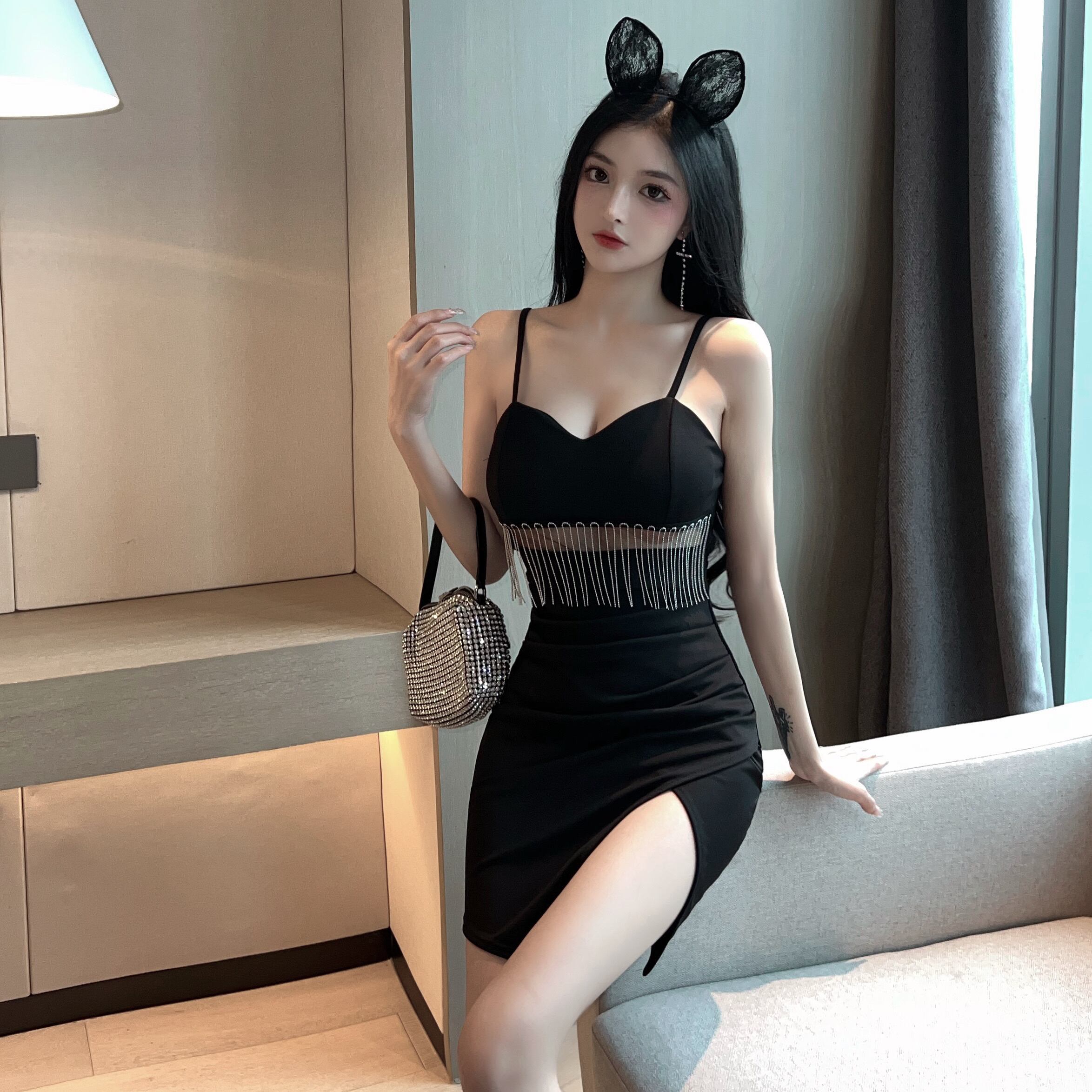 ナイトクラブの女性の作業服作業服セクシーなテルメッシュステッチローカットディープVネックサスペンダードレス micat65554271897