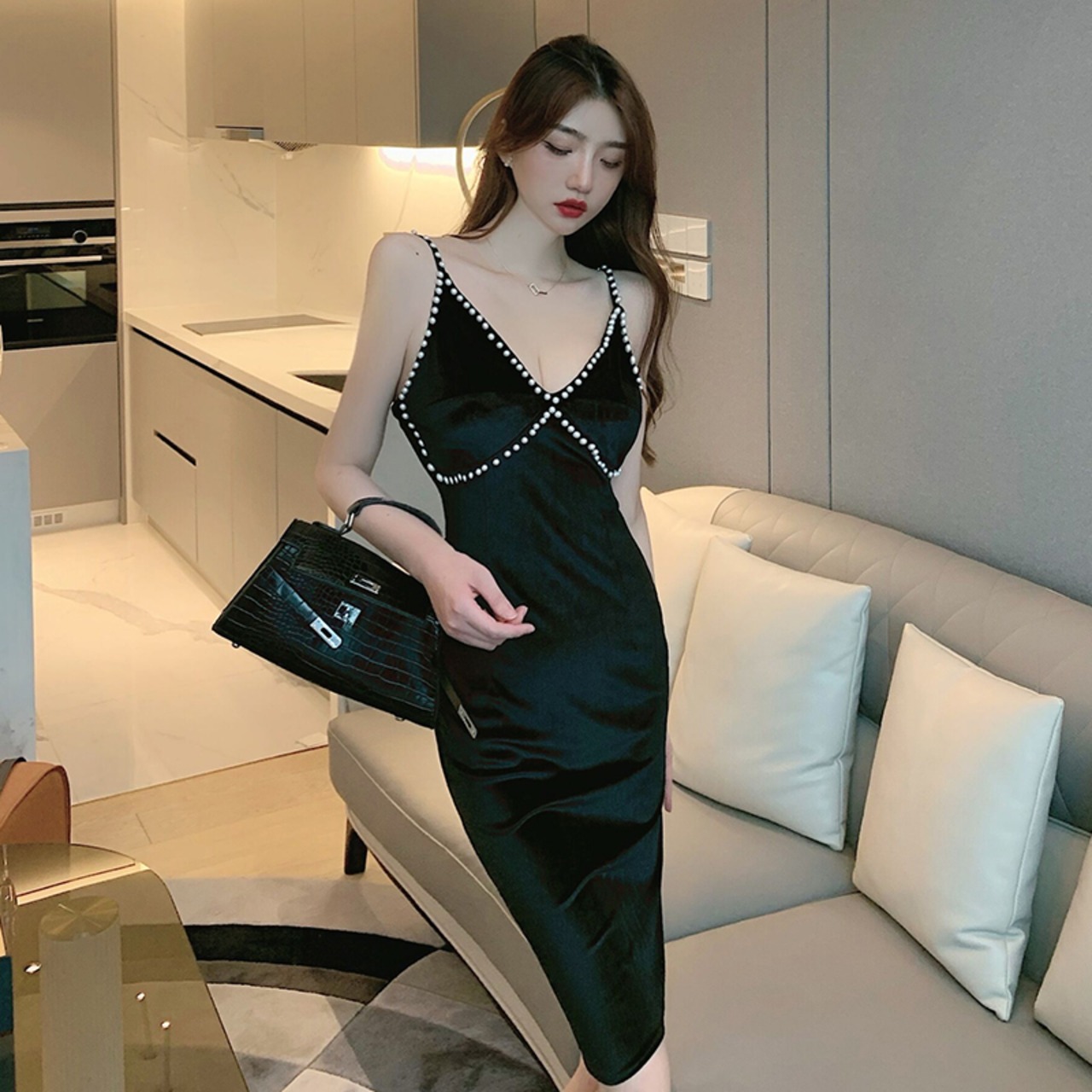 ナイトクラブレディースブラックイブニングドレスナイトクラブスパークリングダイヤモンド気質セクシーなローカットVネックサスペンダードレス micat1246494817