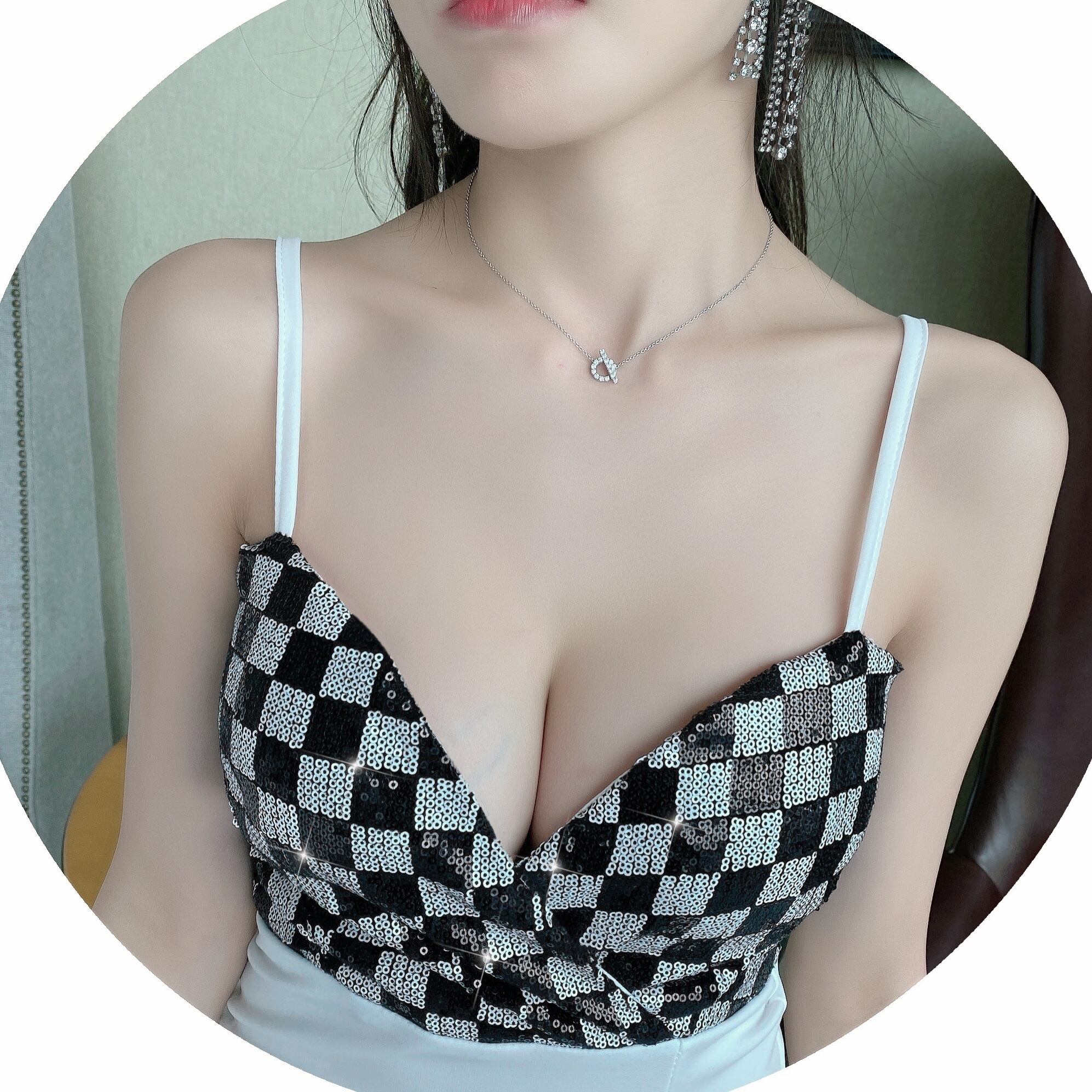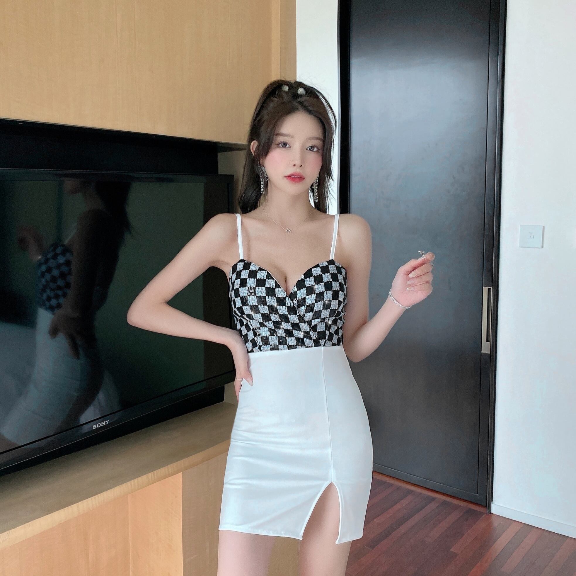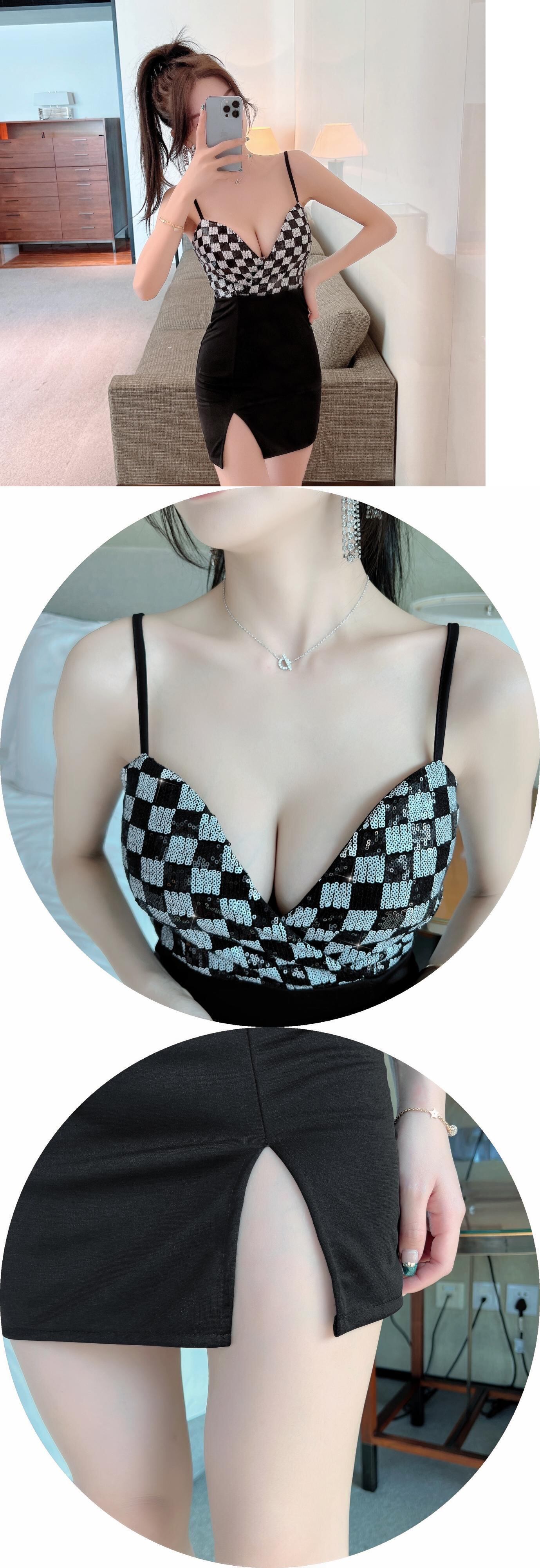 ナイトクラブの女性の作業服セクシーな作業服ローカットディープVネックチェック柄ステッチサスペンダードレス micat95219200405