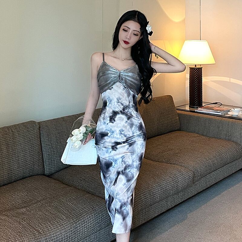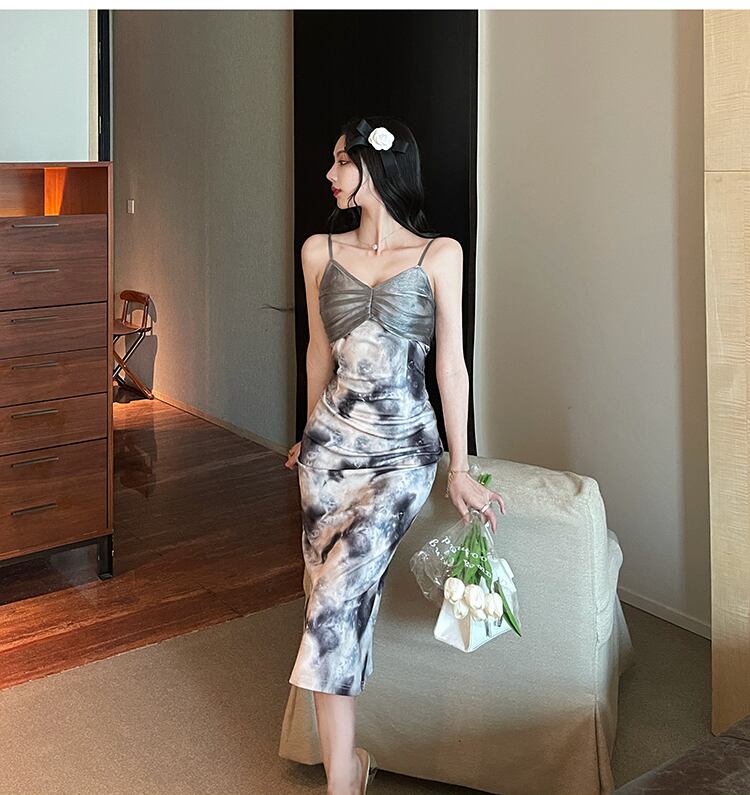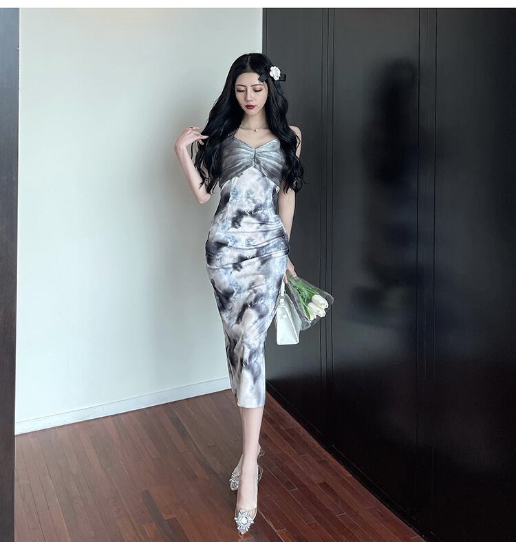 イブニングドレスレディースハイエンド気質海辺ホリデー気質セクシーVネックスリムミドル丈サスペンダードレス micat2488564503