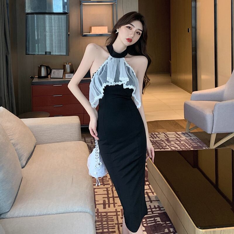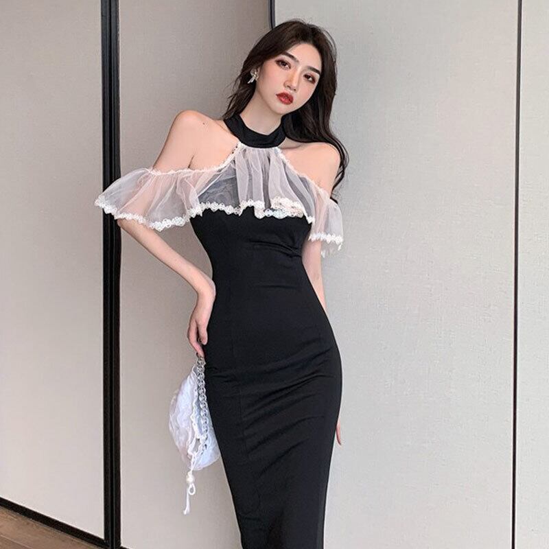 フレンチイブニングドレスロングスカートレディースハイエンド気質ナイトクラブセクシーオフショルダースリムミドル丈ホルタードレス micat124054600