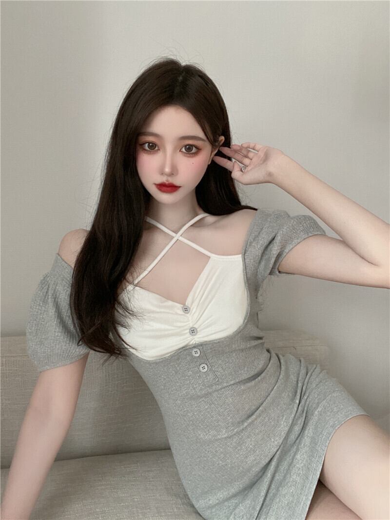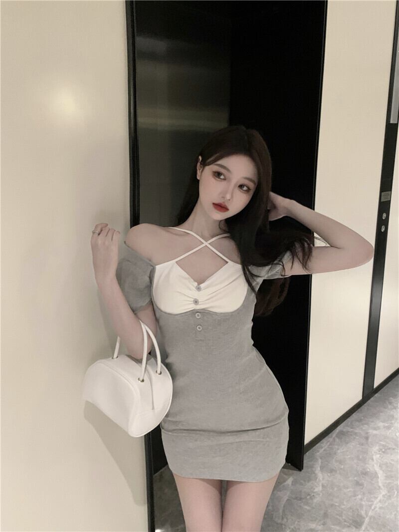 生放送の服、ポジェニック女性のアンカー服、夏、純粋な欲望、セクシーな偽のツーピースのオフショルダーホルタードレス micat27418348465