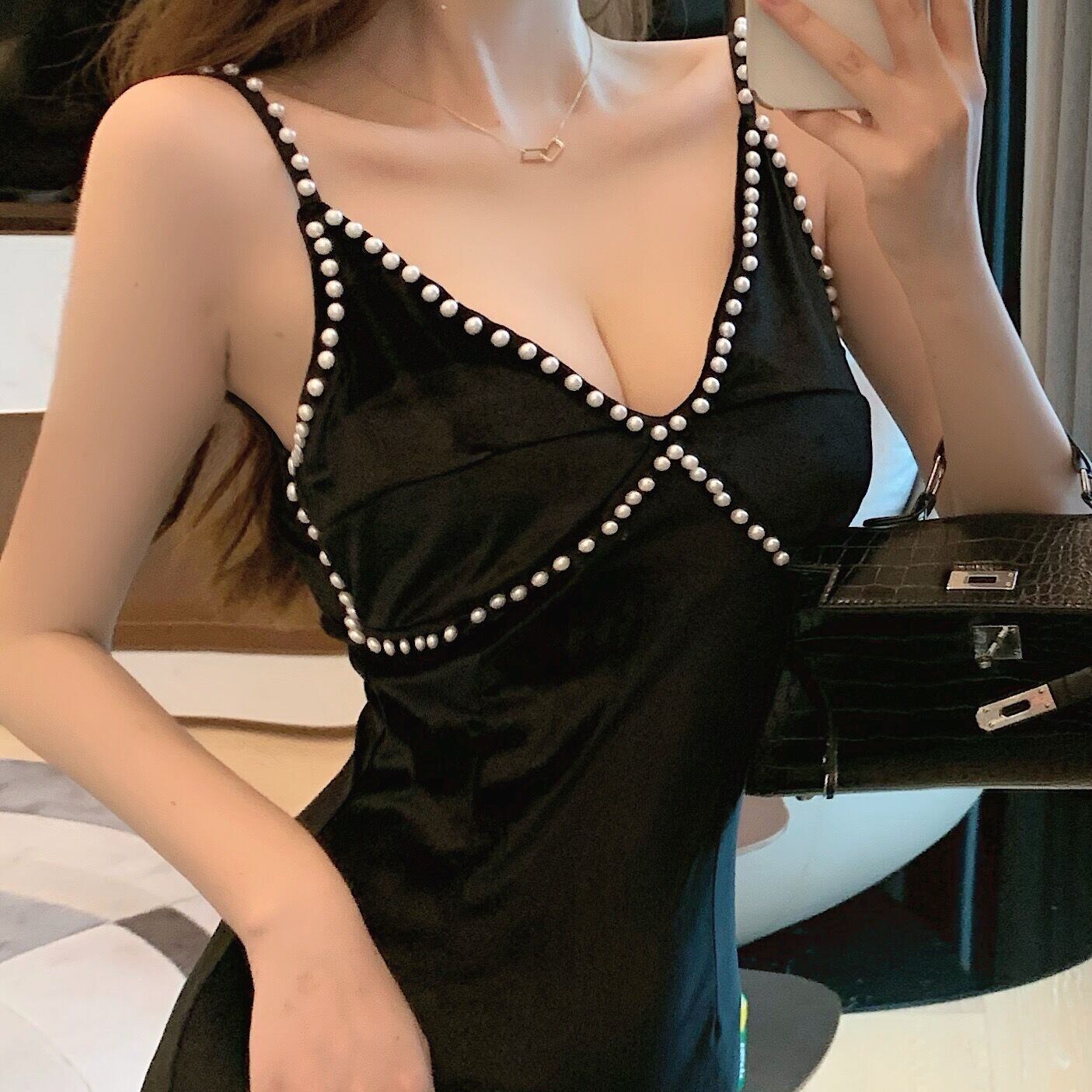 イブニングドレスハイエンドナイトクラブレディースナイトセクシーローカットディープVネックゴールドベルベットミドル丈サスペンダードレス micat49934018200
