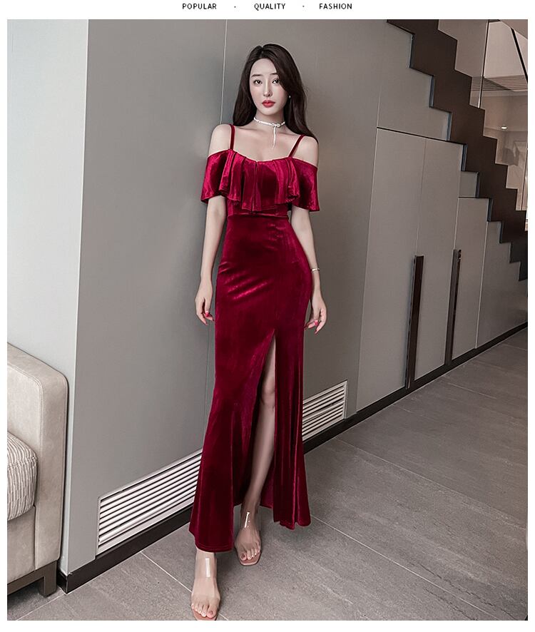 イブニングドレスロングスカート女性のナイトクラブナイトディナーパーティー気質セクシーなワンショルダーゴールドベルベットロングサスペンダードレス micat76569251058