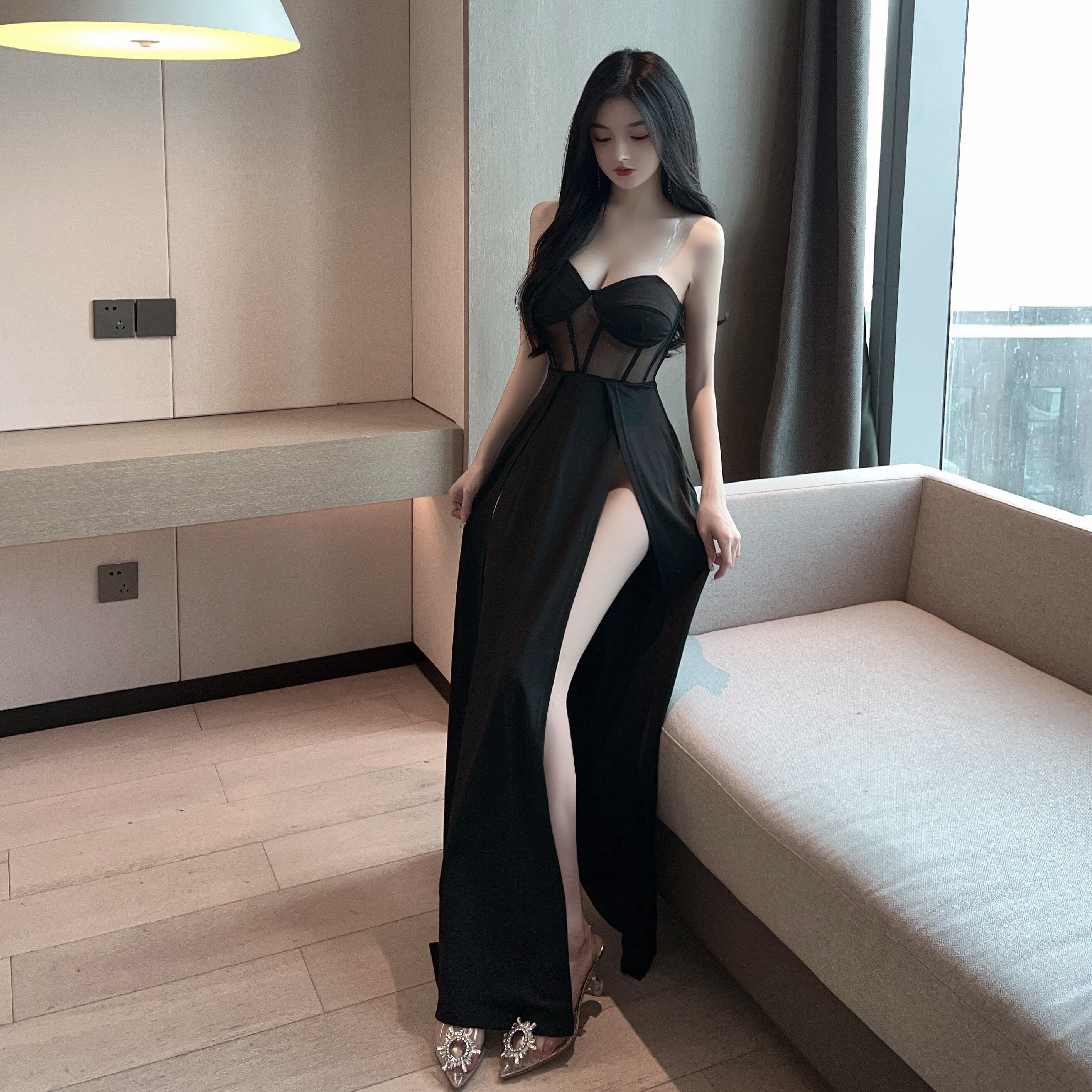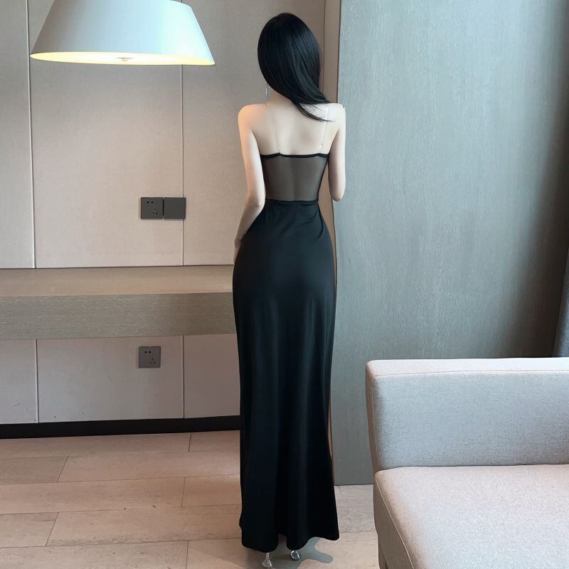黒のイブニングドレスロングスカートナイトショップレディースセクシーローカットディープVネックハイスリットロングチューブトップドレス micat39963490361