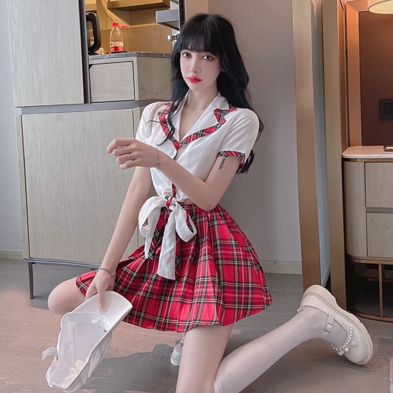jkユニムスーツ女性の純粋な欲望格子縞のステッチセクシーなショートシャツトップ+プリーツスカートツーピースセット micat8661431995